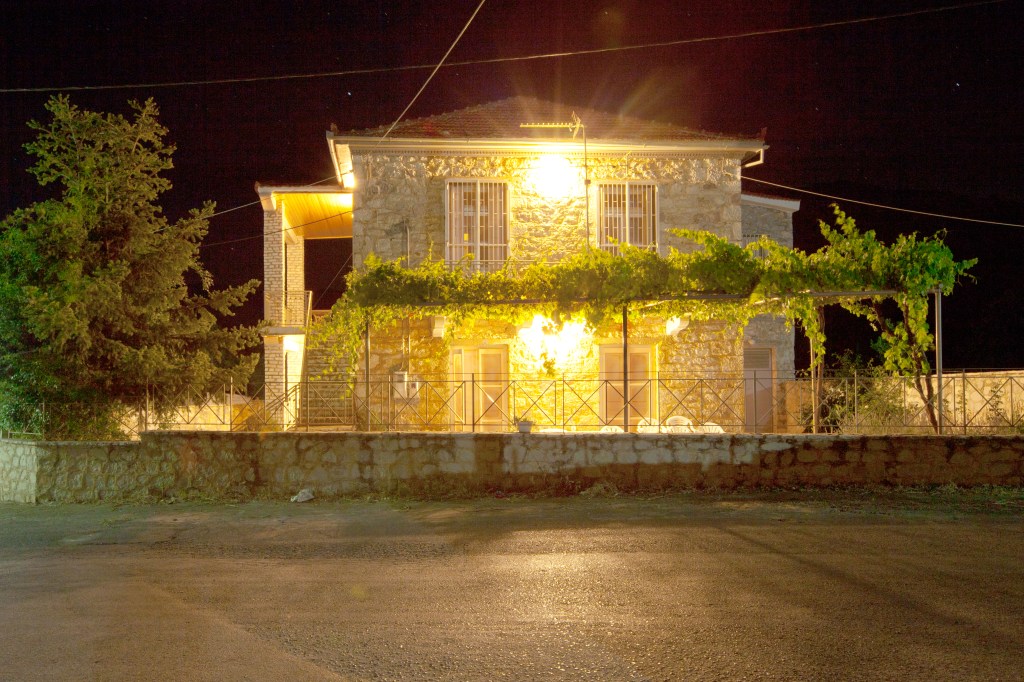 The house is two storeys, made of stone. There are small holes in the masonry that held the rough wooden scaffold as they built the house which was completed in 1936, the year my grandfather John came back to the village to marry his bride Marigo. The red village tiles rise in a simple quadrangular cone above the lines, so that if you were on the roof you would have an uninterrupted view of Analipsi to the north and Mainalon to the south, and a great swath of summer blue sky between. From the street and even the first floor verandas, the view is as good but the sky loses impact with the black and silver lines.
