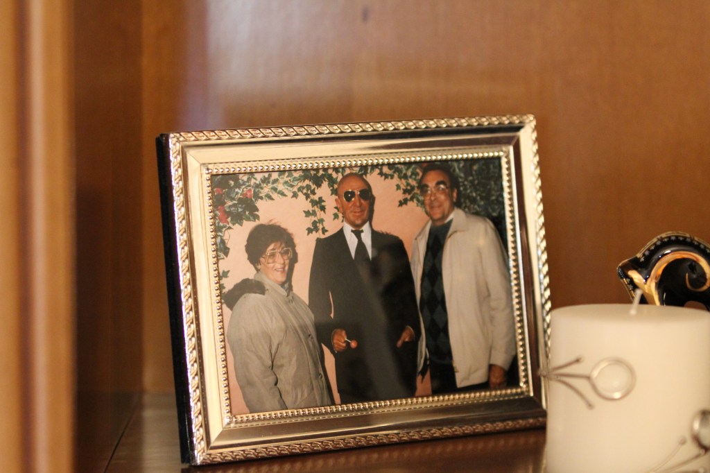There is a double dining room cabinet against the remaining wall that holds glasses and plates and family records, with some odd ornaments and a photograph of my mother and father with Telly Savalas at Madame Tussaud’s in London. I always take a check on this one to see if the actor is real or not.