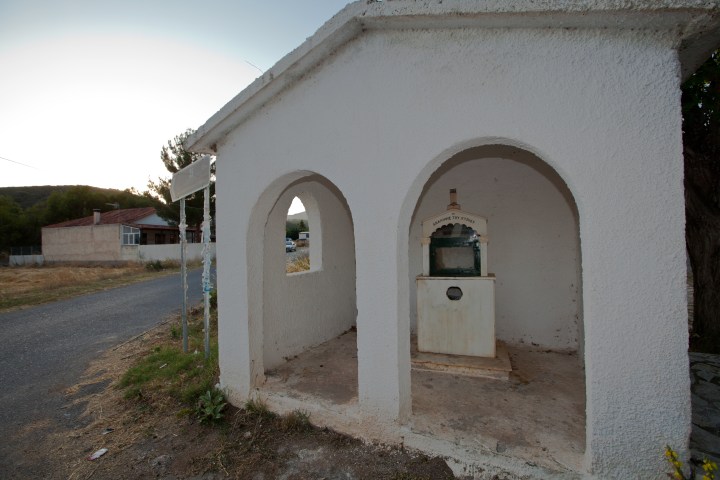 As the avenue ends you enter the village, with Simbonis’ house on the right and the old Manelis house on the left. My grandmother grew up as a Manelis there. In front, in the elbow of the fork, is a bigger iconostasio for The Ascension, and on the right is the now disused village spring, where we used to fill our large glass wicker covered bottles for house water when we first arrived in the village.