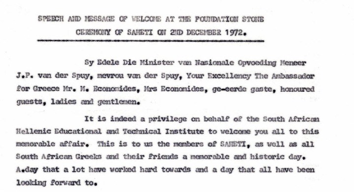 I remember that day Hector Petersen was shot in 1976. That year was my initiation into the reality of life in South Africa, of forced life in the townships that was erupting violently in search of freedom and self determination. In 1972 my father made a speech at the unveiling of the foundation stone for SAHETI. In the audience was the Minister of Education, Jack van der Spuy, of the National Party government. In the audience also was George Bizos, advocate for freedom and defender of Nelson Mandela at the Rivonia Trial. The first year I went to Greece was 1968. What a privilege. We missed two weeks of school in August but in those days we did not miss much and I had to do a show and tell as not many children had travelled overseas that year. The teachers were also thrilled with their gifts of Greek ornaments.