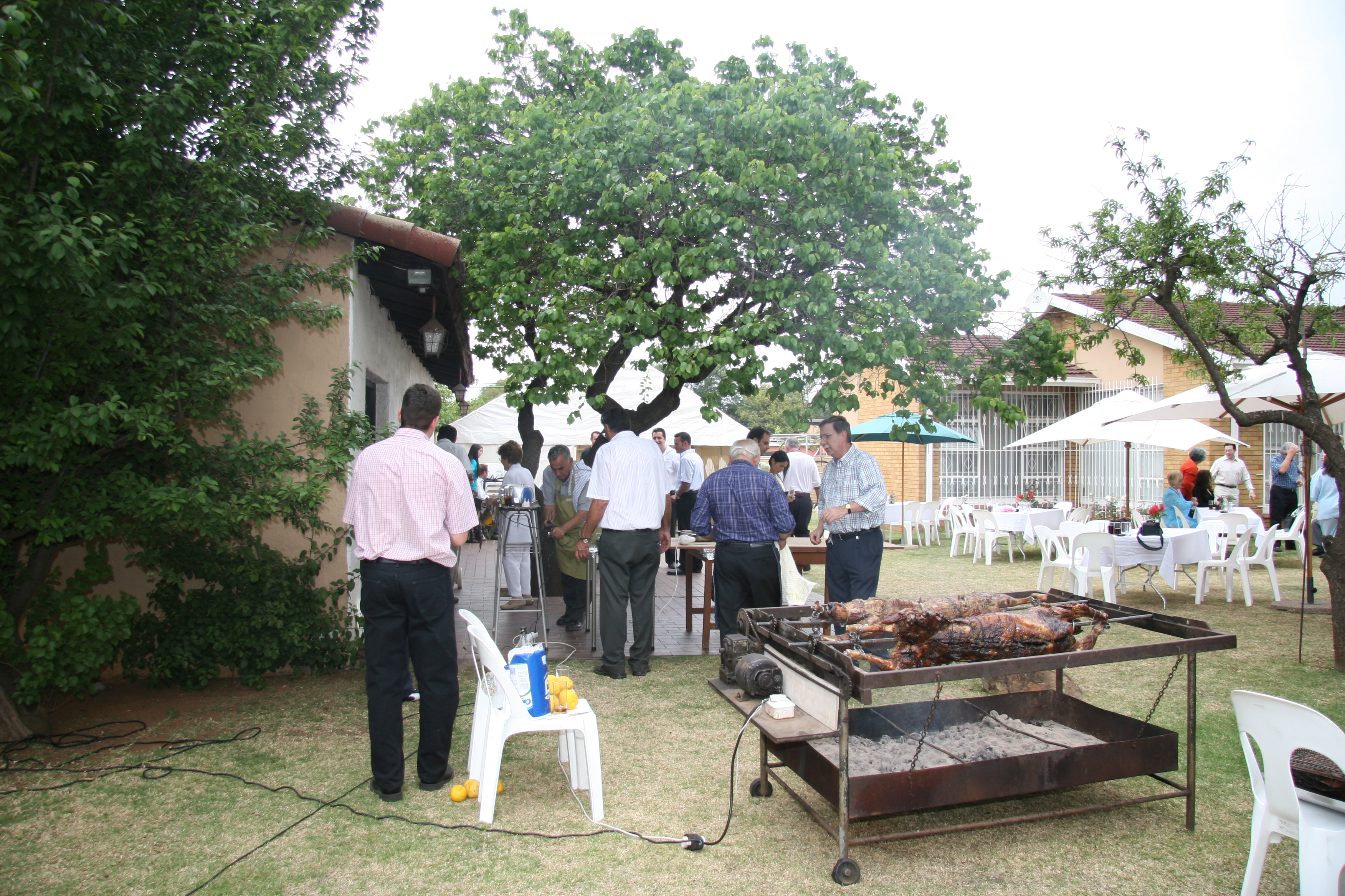 Back home in South Africa the party was held on a Sunday in the pleasant early summer of the Highveld. The venue was my father’s taverna at the back of the garden, and people sat outside under umbrellas and watched the sheep turn on the spit. Most of them were synchronising their eyes with the rotations and planning when they would be able to grab a piece of the crispy skin to snack on before the feast started.