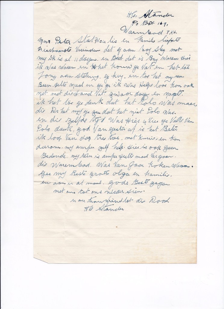 His letter is addressed to my father, family and dearest friends. It is written in old Afrikaans, with more than a hint at Dutch. Mr Stander complains of the heat in Warmbaths. February would have been the end of summer. He developed pneumonia and was bed bound for eleven days. After the diagnosis his one leg went lame and he was worried that he had contracted polio. There had been four cases diagnosed in the Warmbaths community over recent months, and with respect I assume these were amongst the whites only. Using heat treatment and rest to retard the damage done to the spinal cord by the polio virus was in vogue at the time. This much is evident from the medical literature at the time. Who knows, with all these people seeking treatment in the warm waters they probably caused infection of others. Mr Stander was happy when the doctor told him that it was not polio, and that he must get out of bed and walk. He did, slowly, and walked with a “kierie”. He complains that he had to do everything himself, that there was even no maid to help him. With the heat and his illness his garden had dried up and the weeds had taken over.
