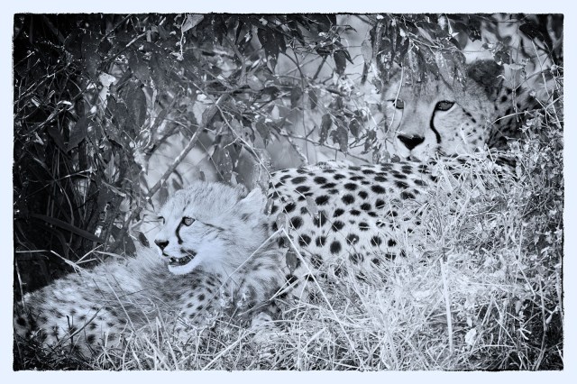 The next day we found Malaika on a termite mound with her cub, who was chewing on the hind leg of a Thompson’s gazelle. His stomach was low and full, but still he ate. After a while they moved higher up under the shade of a tree. The cub started to play with mom, who was exhausted and all but ignored him.