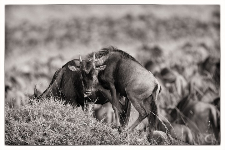 When we returned to the Mara Reserve five days later the wildebeest had dispersed. Some had crossed the Mara River to take up temporary residence in the Mara Triangle, and some had moved north to the marsh Plains. Two days later we noticed a huge herd blackening the horizon south of the Talek River. The herd extended from the hills in the east to Lookout Hill, a lone koppie in the plains. The next day we were lucky enough to be in a hot air balloon flying along this great herd. I think I stopped breathing as we drifted silently at low level. It was early in the morning and they were still, but some young teenagers were playing and all of them were grunting. The low “gnu’s” resonated in the veld, drifting up to our heaven.