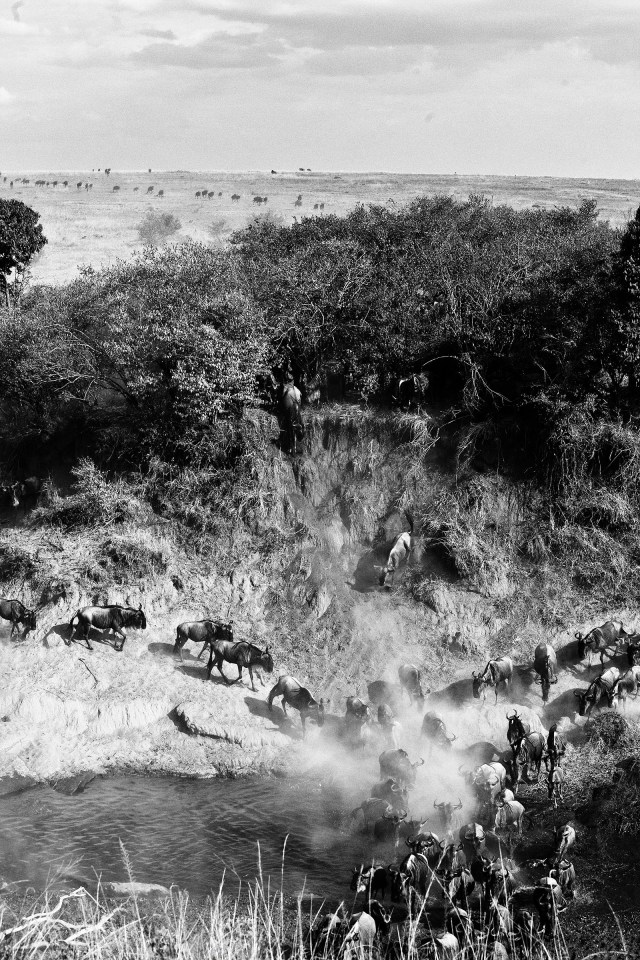 After lunch and some work on pictures, we saw the animals gathering again on the south slope of the Talek. We forced Ines to down her afternoon tea and rushed her to where Onesmus thought they would cross. As we waited they seemed hesitant. We were shooting against the light as they crossed, and once the advance group had set the pace, we drove straight through the turmoil to shoot with the sun on our backs. The dust was everywhere and made for brilliant eerie pictures as the wildebeest streamed over the steep bank , into the water and across. Thick clouds of dust rose and covered us. On each side of the crossing, which was shallow and had rapids, was a deep pool. A lone hippopotamus moved slowly from our left with the flow of the water to the crossing. It hesitated then burst through the moving mass of wildebeest. It was knocked over, stumbled and forced its way to the downstream pool on our right. The crossing continued for ten minutes or so. It was absolutely incredible.
