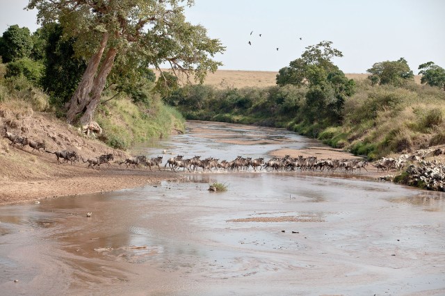 The first was before lunch under the trees at Rekero Camp on the Talek River. We were having a drink as someone shouted “they’re crossing!’. The river was low and the wildebeest streamed over the steep banks, over the rocky river bed, slashing in the pool that was home for a hippo that was not impressed.