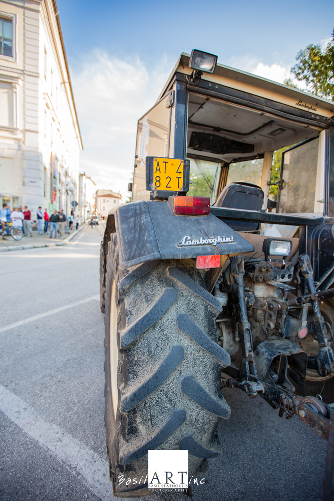 On the afternoon of the competition the teams gather in the piazza of Rocca di Mezzo and put on a demonstration on the road in front of the old school, with a single tractor, worn from work but the bonnet draped proudly with the Italian flag. The demonstration model was a Lamborghini, the genuine machine. The old man started out making tractors and in the fifties when he bought a Ferrari and went to Enzo to suggest some improvements, he was rebuffed. He decided to match it with a supercar of his own, named initially after the size of the engine but later after victorious bulls from the coredas in Spain. The tractors remain nameless, unlike the legendary Muira and Countach.