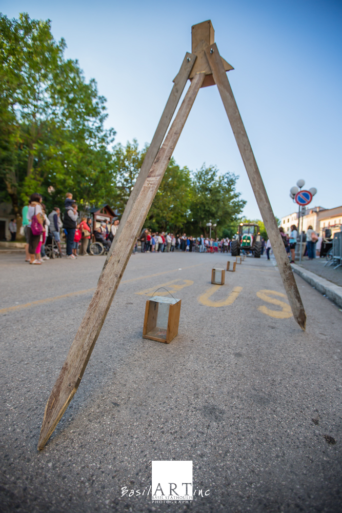 The demonstration in the piazza is accompanied by commentary on the history and technique of the competition, given by a group of young people on a stage that is used for all the summer village functions. Instead of ploughing up the tarmac they have a big funnel on the back of the tractor that drops a line of sand onto the tarmac. First the “surveyor” of the “squadra” (the team) lines up a plumb line from the start point. The he instructs the members to place the “contraposta” lined up on the crest of the next slope. This is a wooden tripod with a lantern burning brightly. The instructions are shouted across the distance, sometimes relayed by team members, and are very specific to the anatomy of the geography.