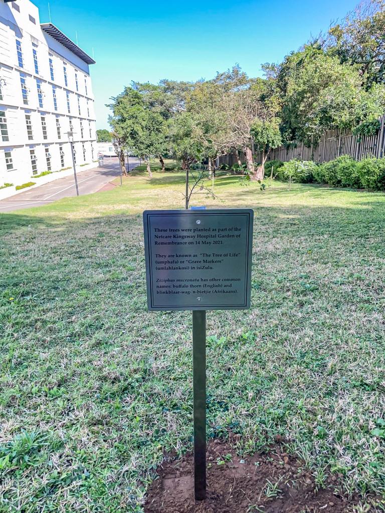 We have a garden of remembrance as you enter our hospital. It has two benches, three tall aloes and a variety of African indigenous lilies. There are two glass walls with stainless steel plaques for anyone to pay homage and remember the departed. One wall has become the Covid-19 Memorial.