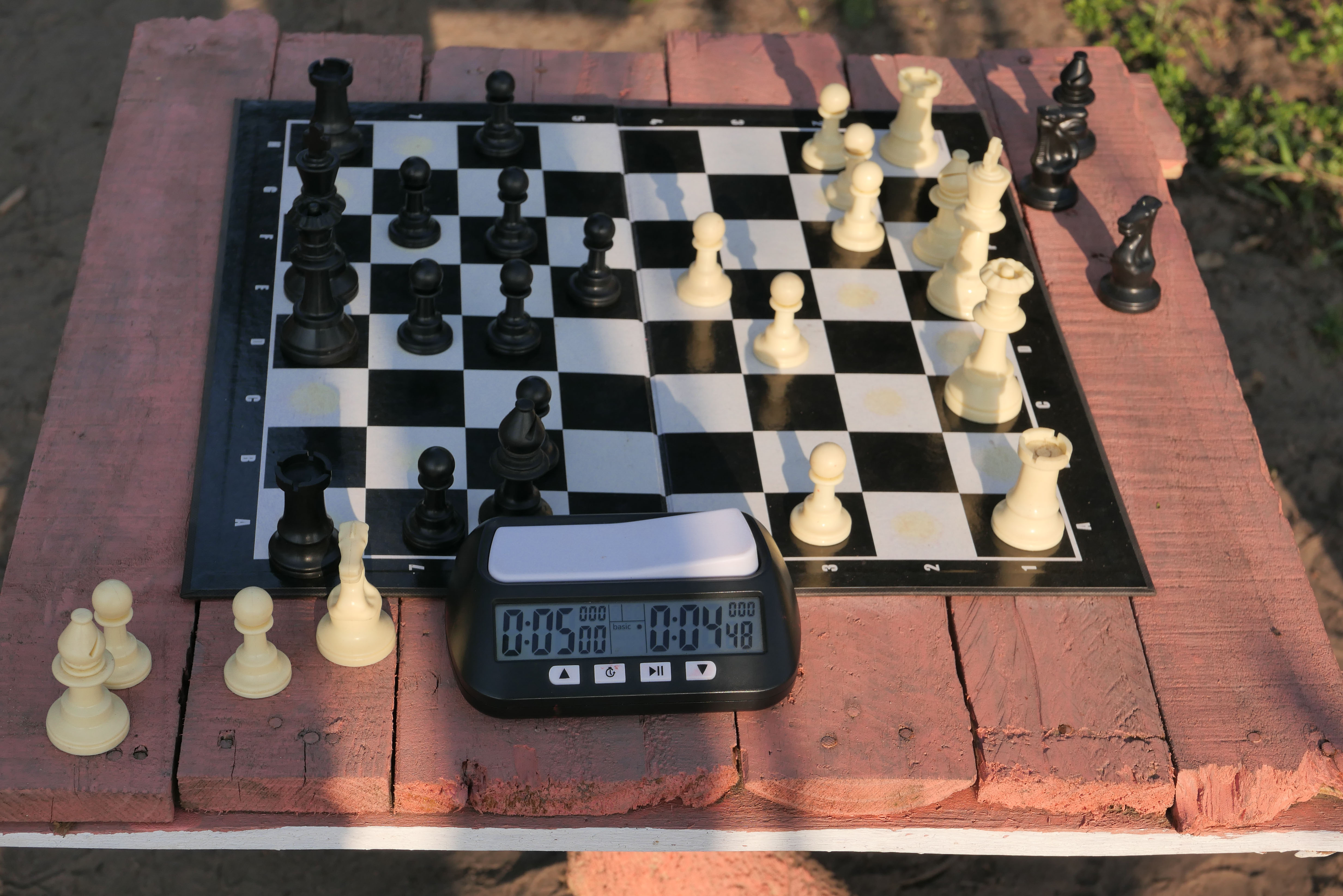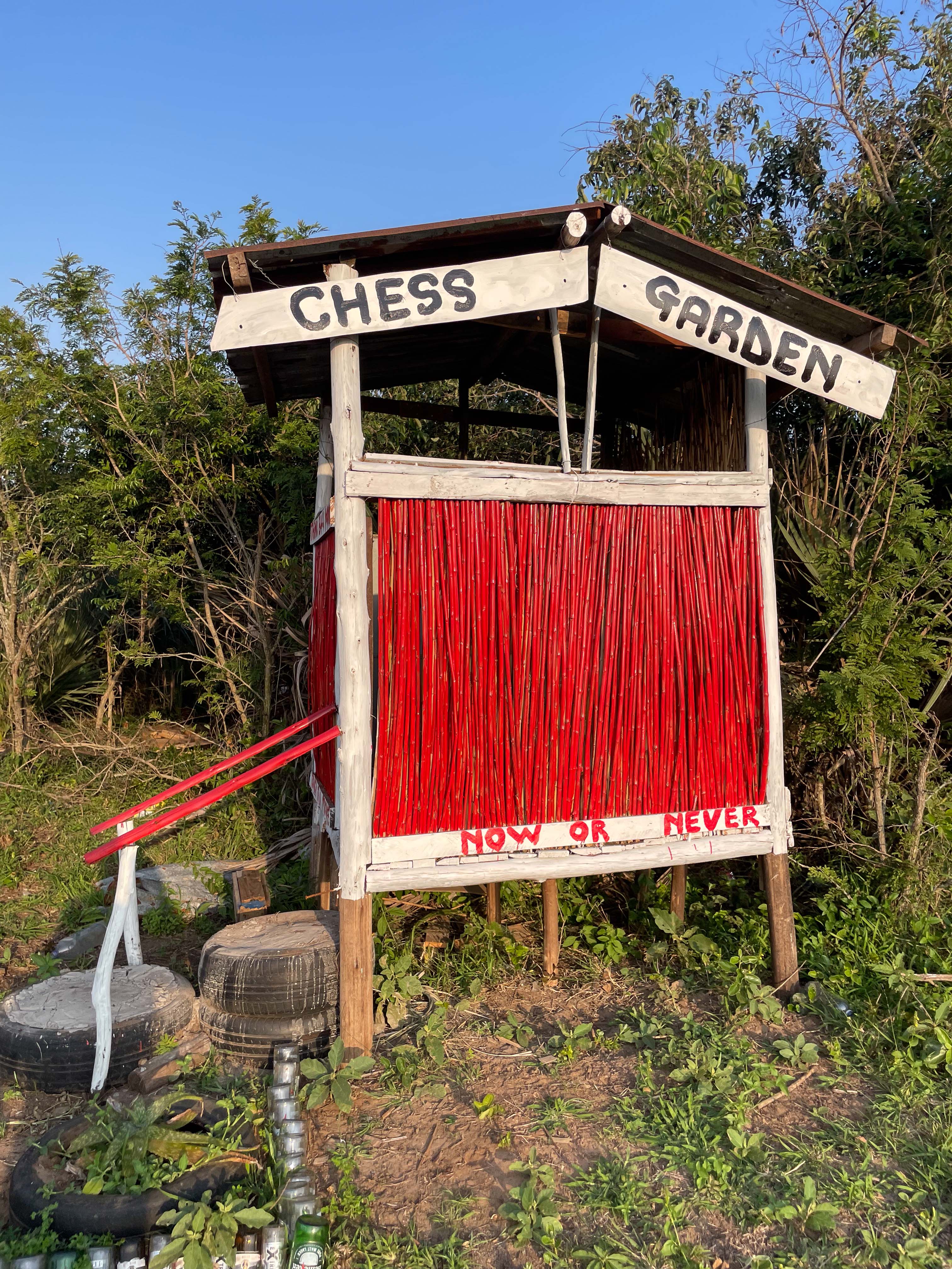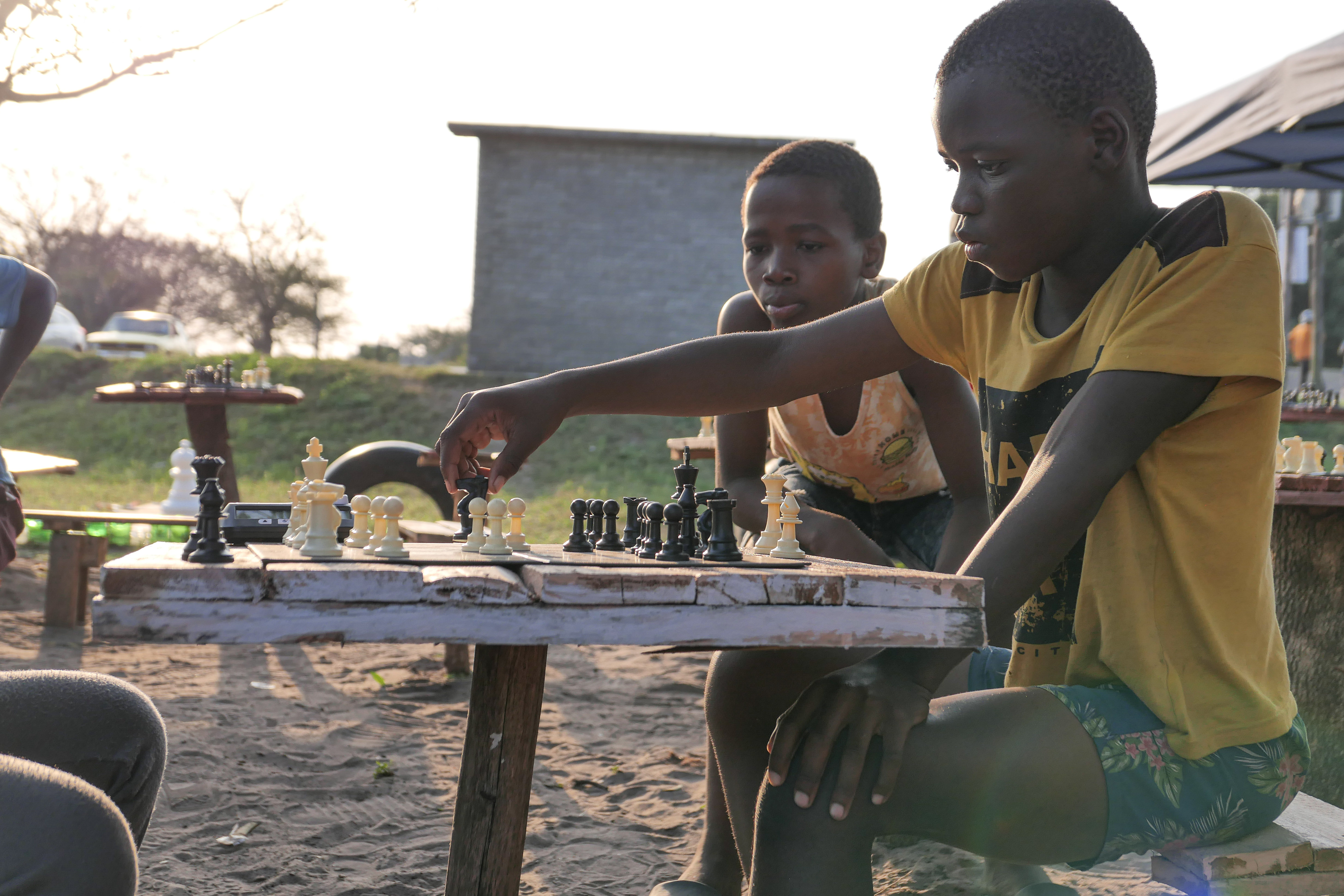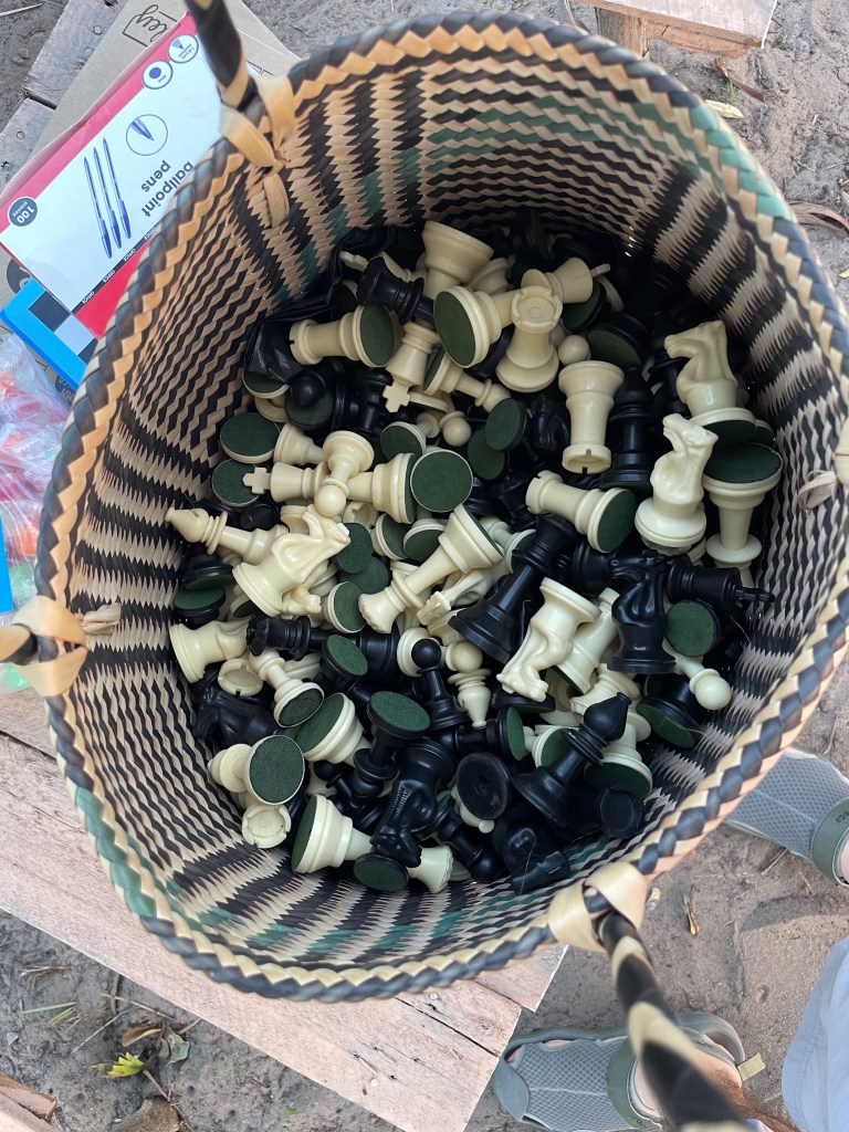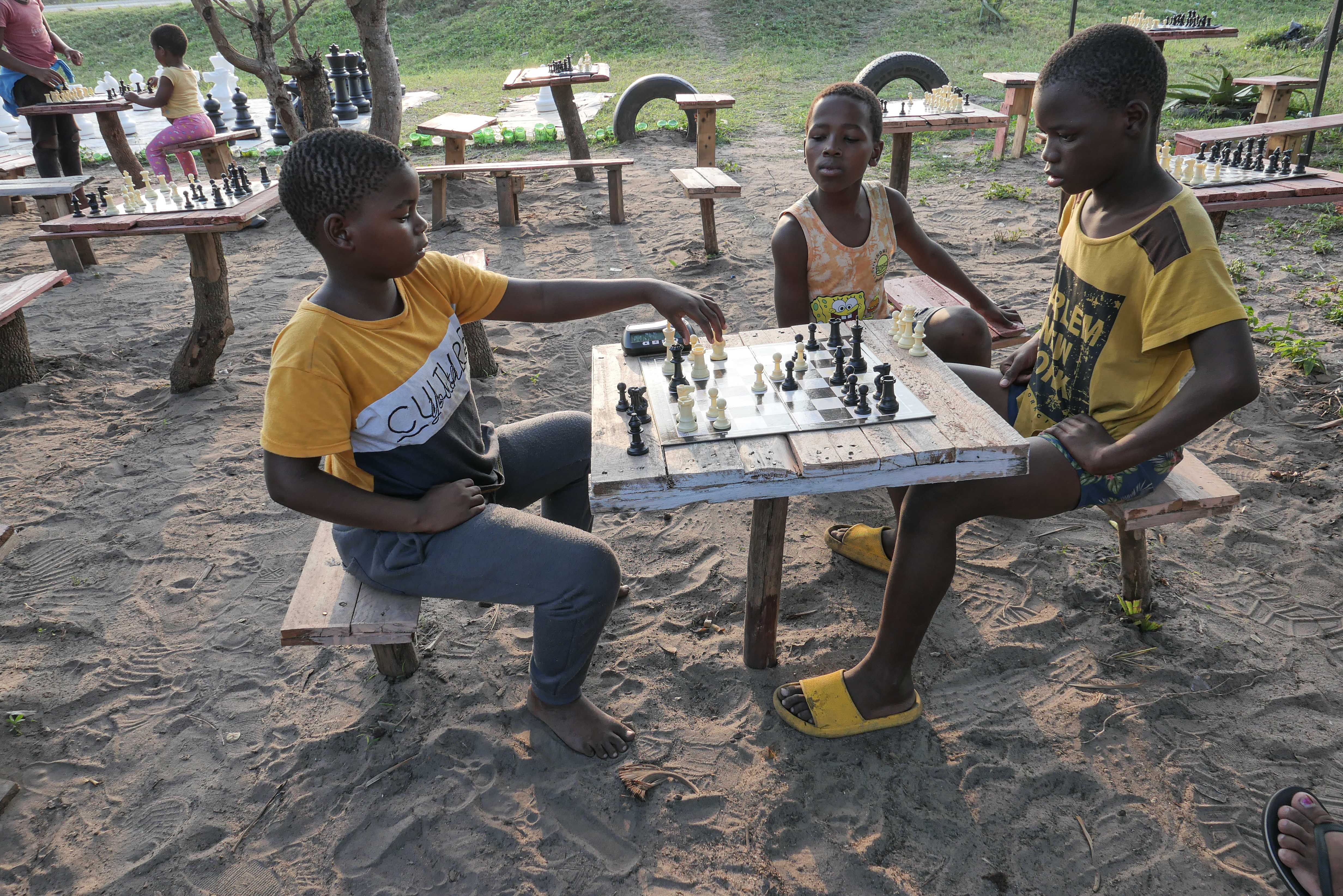 Arriving the day before, I sat down with Lucky at one of the little tables to catch up. The growth of the chess club is a community effort. Maria Kouvarellis and her father Nick donated woodwork tools, pink paint for outdoor furniture, and some of the chess sets. The plasticized boards are nailed to tables, and pieces from twenty-five sets harmoniously mix in a large woven Zulu basket. The children respectfully pick up the pieces and place them on the boards, each understanding its role in the chess village.