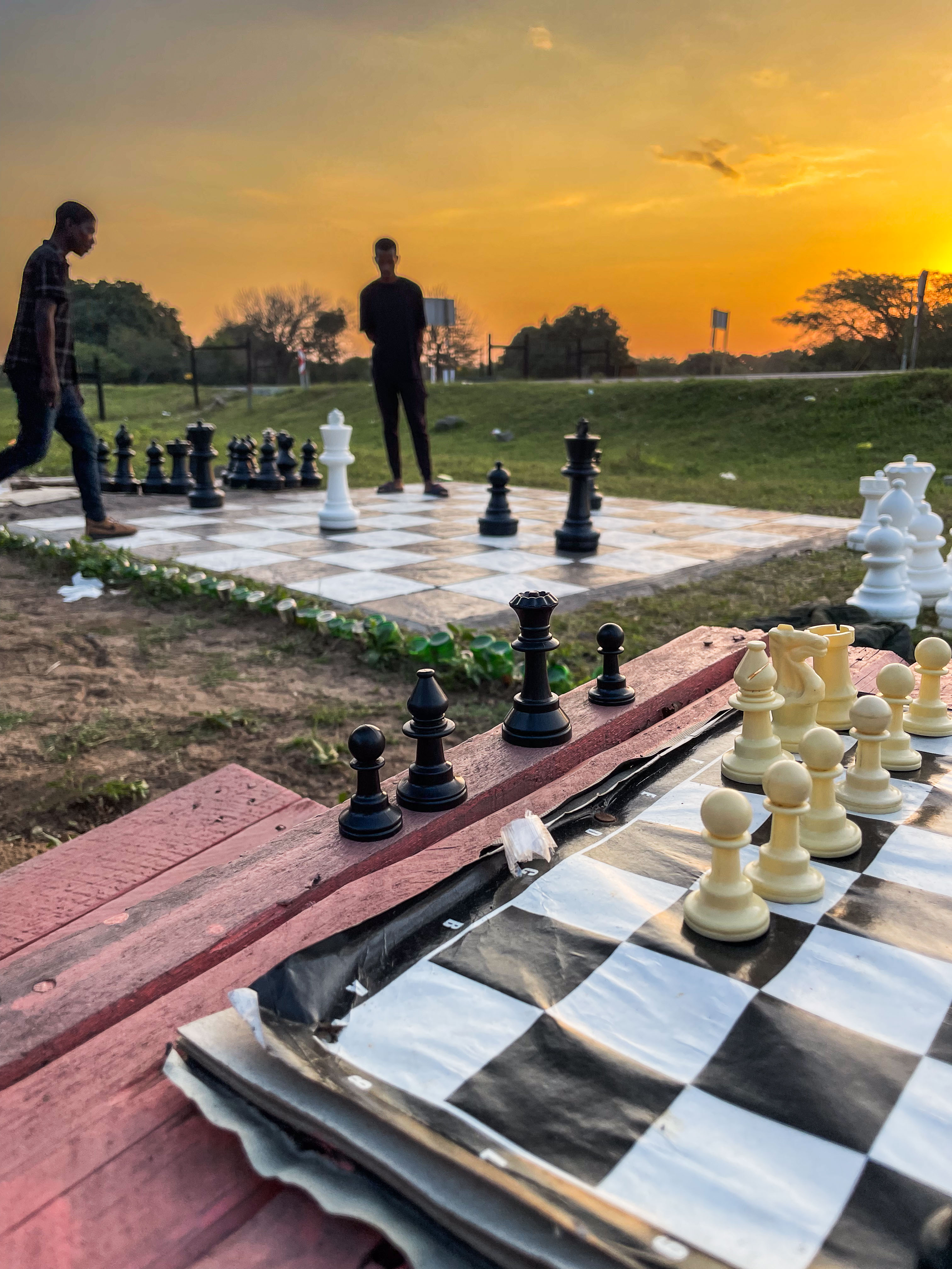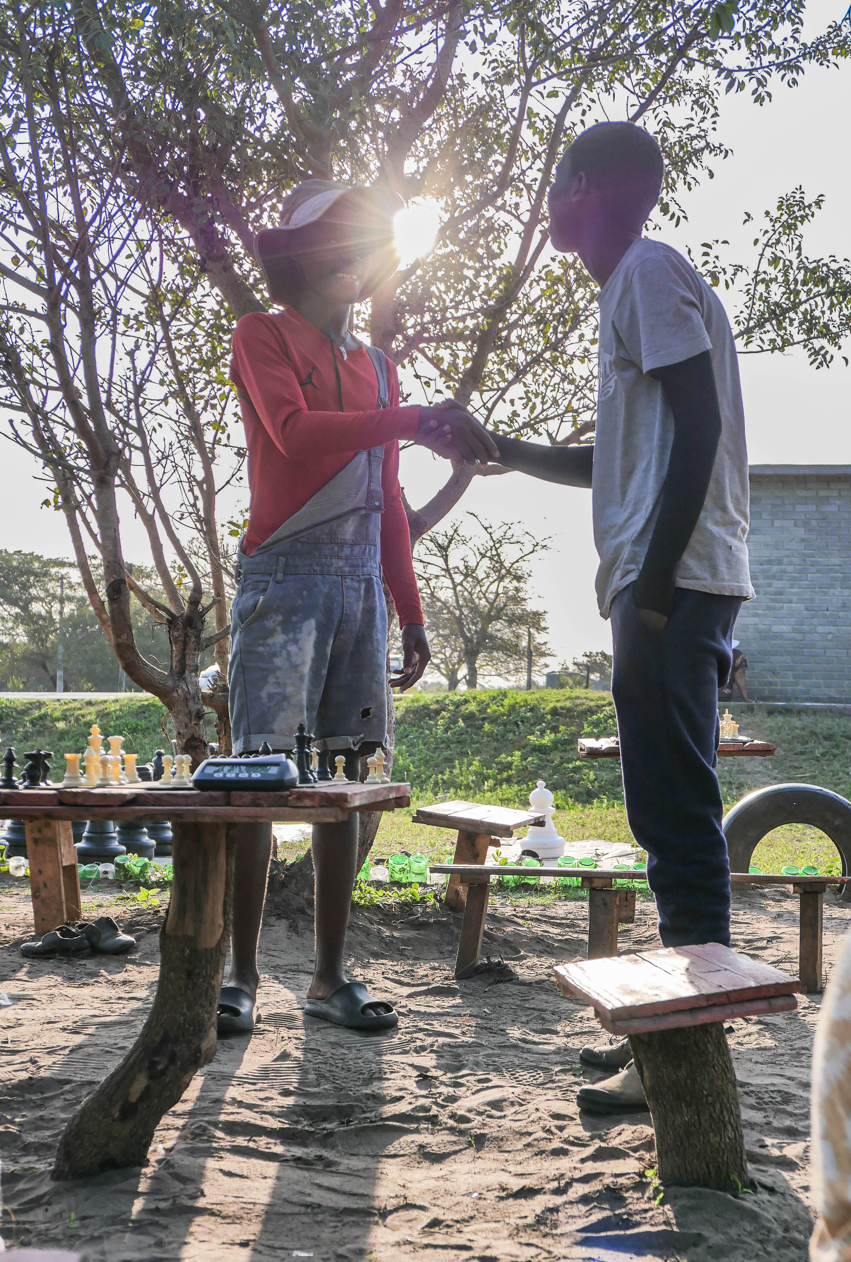 The final eight players competed with intense concentration, timed on new chess clocks for five-minute games. Winners were decided based on remaining pieces if the game didn’t end in checkmate. The final match between Mxolisi and Kholeka took place on the new giant chess set. Mxolisi, regaining his chess mojo, won on points. A sizeable crowd, some seated on newly constructed spectator benches, watched the thrilling game.