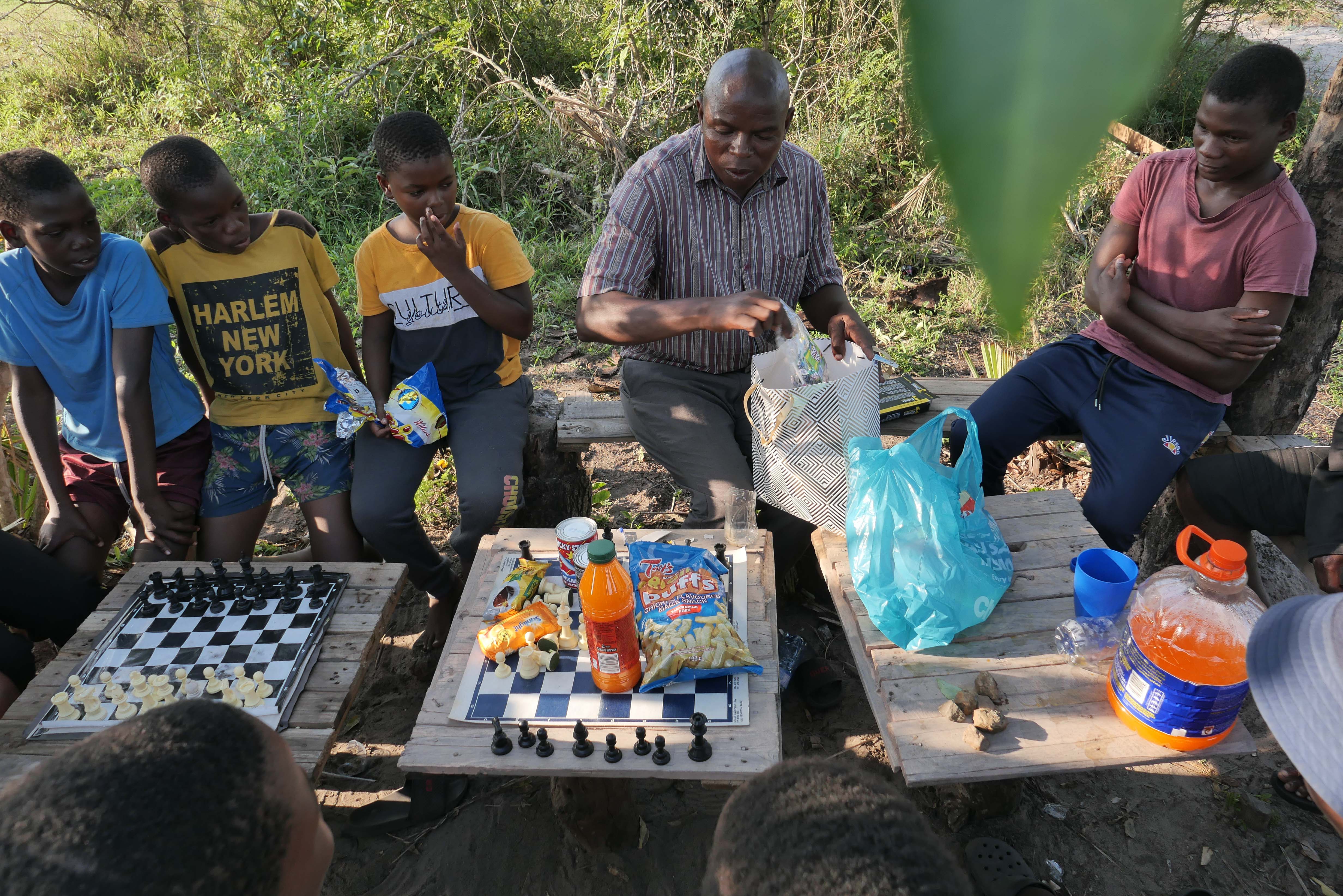Proudly, Lucky presented the prizes to the winners on the giant chess board. Mxolisi beamed as he unpacked his prize, with the kilogram of sugar being the most impressive component. As I chatted with Lucky about the tournament, Mxolisi and Kholeka excitedly ran home to show their families the prizes.